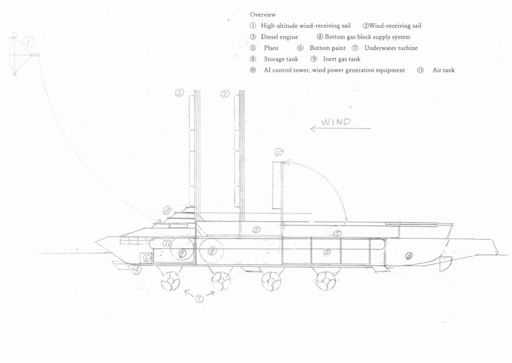 本構想は、故・青木繁光氏が発案し、NEDOにも申請された帆走型洋上風力発電システム「Ocean Energy Harvesting Vessel」をベースに、更なる技術・性能向上・応用性を加えてアップデートしたものです。自然エネルギーの最大活用、CO₂の資源化、洋上生産プラントの融合を目的としています。